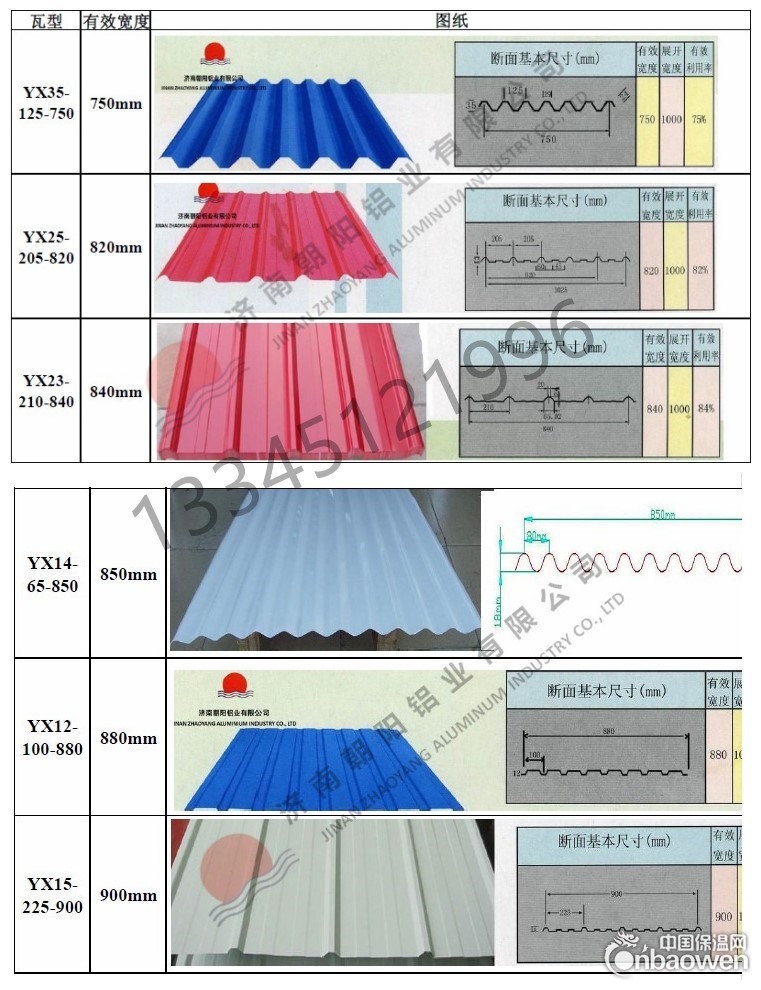 压型铝瓦是我公司成熟产品,光铝压型铝瓦现货供应,彩色压型铝瓦可定做聚酯或氟碳涂层,主流颜色包括红色,蓝色,白色等。我公司配备750型,820型,850型等多款压瓦设备,可根据客户要求压制市面主流的瓦楞铝板。我公司可生产0.2-1.5mm厚度的铝瓦,目前主流的瓦型750型 840型 850型及900型销售火热,我公司可根据你的要求压制超长铝瓦,常年备有压瓦所需的铝卷,彩涂铝卷,可及时发货。欢迎咨询洽谈。 什么是压型铝瓦(瓦楞铝板) 瓦楞铝板,又成为压型铝瓦。是建筑常用的产品之一。目前有替代不锈钢以及铁板的趋势。彩色铝瓦,顾名思义,即做了涂层的铝瓦,目前市场主流的是聚酯涂层的铝瓦,当然,客户可以根据自身需求,选择氟碳涂层的铝瓦。 瓦楞铝板(压型铝瓦)的优势: 首先,由于铝的密度只有2.71而铁的密度达到7.8,所以每平方铝瓦的重量不足不锈钢的1/3、很很好的减轻企业成本,并且能减轻支架的压力。 其次:铝具有良好的防锈效果,在外界坏境中,雨水,暴晒,大雪对于铝几乎没有什么损坏,并不行铁皮那样,见到雨水以后就快速生锈, 由以上两点可以看出,铝瓦在很大程度上能完全替代不锈钢材料,同时造价更低,是建筑行业首选的材料。 我公司主要压型铝瓦瓦型及规格 济南朝阳铝业公司专业生产,加工各宗长度,宽度的铝瓦,并且还具有喷涂技术,可以再铝瓦的表面进行氟碳,聚酯喷涂,滚涂加工。 主要瓦型: YX35-125-750(V125型)铝瓦;YX25-205-820型铝瓦;YX23-210-840型铝瓦;YX14-65-850(弧形)铝瓦;YX12-100-880型铝瓦;YX15-225-900铝瓦; 铝瓦、瓦楞铝瓦广泛应用于各建筑行业,可进行氟碳式喷涂,主要颜色按照劳尔色卡由客户订制,常用颜色有红色,蓝色,白色等。 主要规格